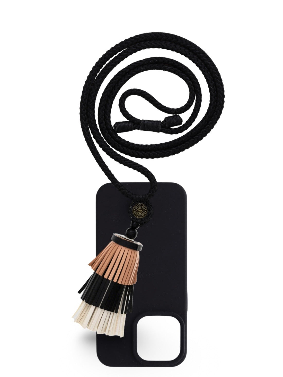 - Tassel: Tan/Black/Off-white vegan leather fringe.
