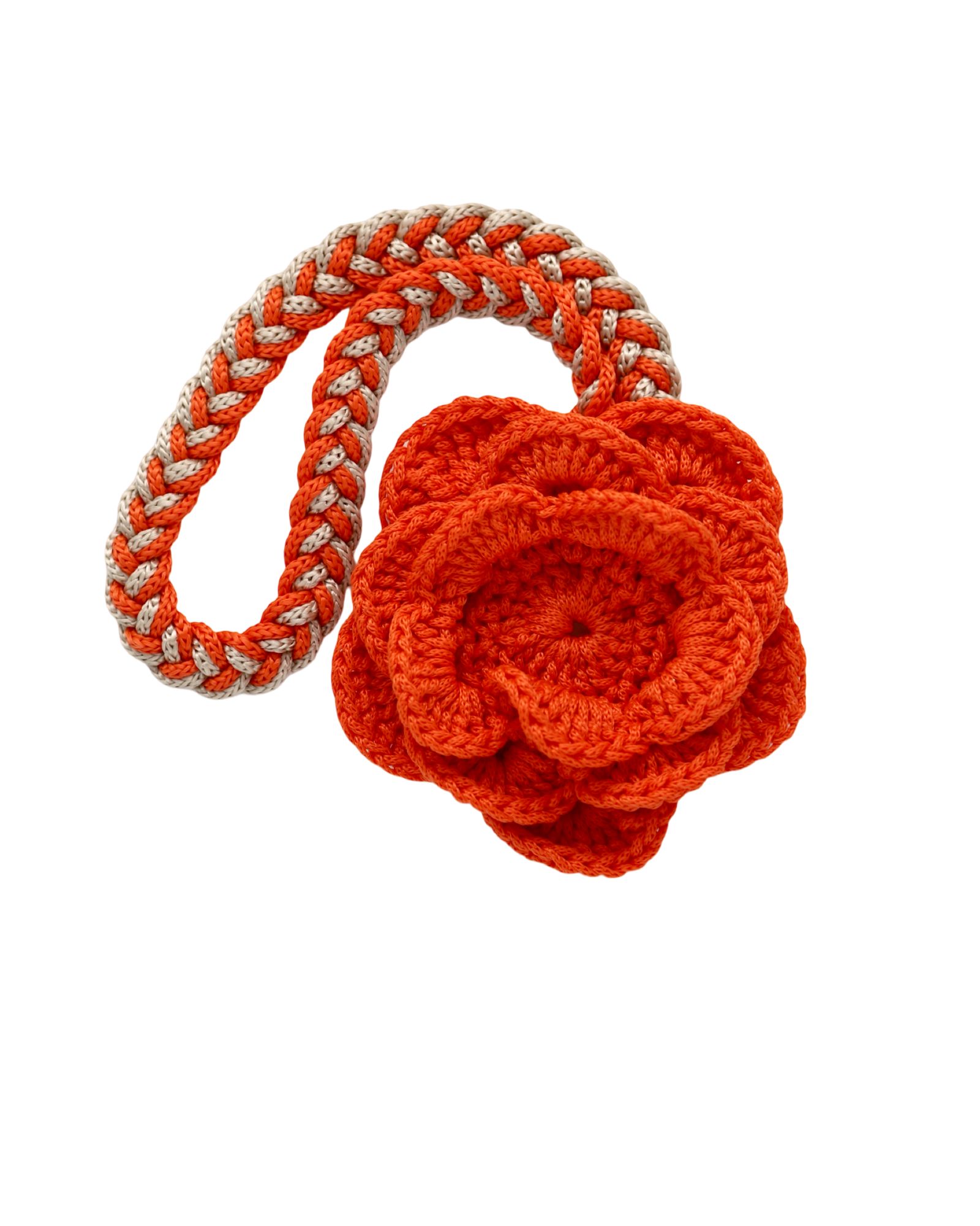 Crochet flower with braided strap.